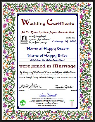 I look forward to celebrating your continuing love and commitment with your Vow Renewal! #Certificate ![]() The Marriage Certificate you receive, conforming to Missouri law, is, I think, a more fitting keep-sake than the forms county offices provide, more suitable for framing or your wedding book or papers. If you send me a photo of your marriage license when you get it from the courthouse, I can prepare your certificate ahead of your wedding day which saves some of the paperwork at that time. I usually need a couple days to get the certificate printed. You keep the Certificate. In recent years, an increasing number of couples, or various reasons, prefer to return the license themselves instead if of asking the officiant to do it. To save confusion, I have learned from this and now make it a routine part of the marriage documentation. Most couples, either when they register for a license or when they return it, request a certified copy of the marriage license to be sent to them after the county registers the license. "Fun Fact"? Missouri counties have their own marriage license and certificate forms, differing from one another. Some counties include the ages of the couple. Some ask for the signatures and addesses of the witnesses; others want only the signatures plus the names printed. Some counties have two identification numbers on the top of the license; others have just one. Some counties print the names of the couple on the certificate; others require the officiant to write them in the blank spaces. One county asks the officiant to print his or her name twice and sign it once -- on the same sheet of paper, the license As far as I know, only Clay County sometimes asks the name and phone number of the officant when the couple apply for their license -- but most of the time this does not seem to be requested. Maybe this is a preference of a particular clerk. However you get your Misssouri license, we'll get you properly married! |